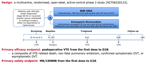 SHR-2004是永利娱乐城医药自主研发的一种抗FXI的人源化单克隆抗体,通过阻断内源性凝血途径的级联反应过程发挥抗凝作用。SHR-2004-202研究是一项多中心、随机、开放标签、阳性对照的II期临床研究(NCT06220123),旨在评价皮下注射SHR-2004在III-IV期或复发性卵巢癌手术患者中预防VTE的疗效与安全性。